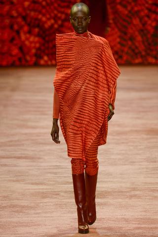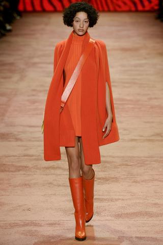 Gorgeous deep chestnut leather—again paired with orange by Akris.