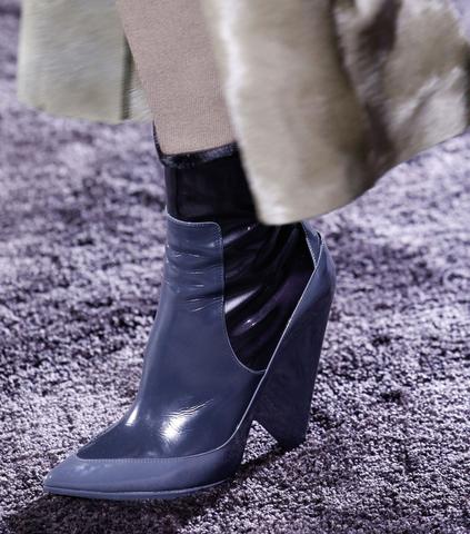 This duo of ankle exotic leather boots in a multitude of delightful patterns features a blocky heel—an overall mainstay of 2016 fall footwear. The large silver buckle is a Victorian nod; Burberry paired these kaleidoscopes of color and pattern with geometrically striped tights.