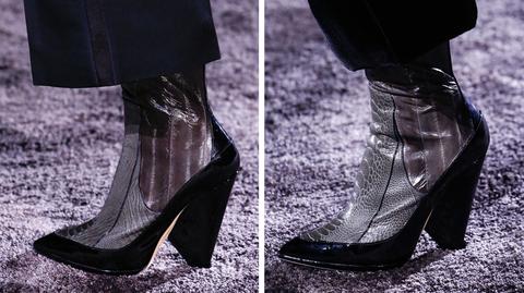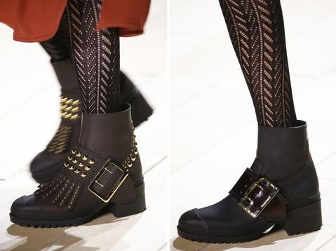 This duo of ankle exotic leather boots in a multitude of delightful patterns features a blocky heel—an overall mainstay of 2016 fall footwear. The large silver buckle is a Victorian nod; Burberry paired these kaleidoscopes of color and pattern with geometrically striped tights.