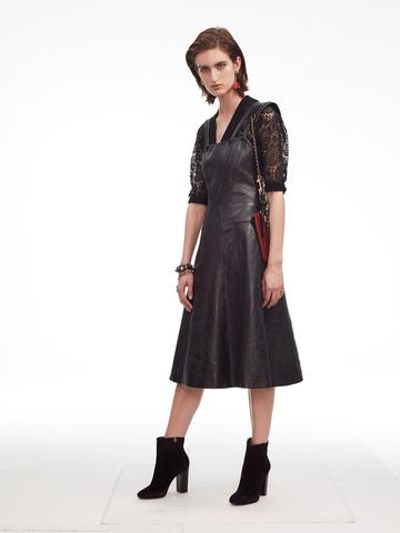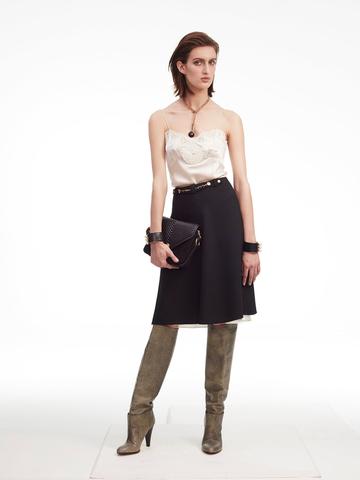 See what we mean about Maison Moyle details? A delicate slip just peeks out underneath the knee-length A-line skirt, and the boots go up just above the knees. The leather is speckled and mottled and there’s an extra cuff around the ankle. Elegant.