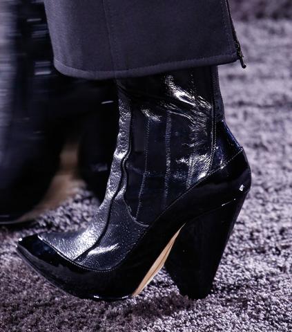 Let’s all pause and take a moment to admire this Wicked Witch of the West pointy, curved toe. The combination of patent and distressed leathers is paired with a triangular heel for an effect that is nothing short of magical. (And the pairing with a pant that has a zipper on the back of the ankle is another fun touch.)